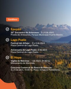 En la región cordillerana, se despliega una nutrida agenda con eventos culturales, ferias y celebraciones para toda la familia. En Epuyén, tendrá lugar el 32° Encuentro de Artesanos entre el 3 y 4 de abril, en el Predio de Artesanos ubicado en el Parque Municipal Puerto Bonito.