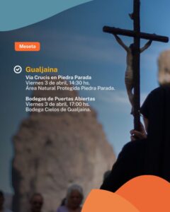 En la región de la Meseta, las actividades invitan a vivir experiencias en entornos naturales únicos y propuestas productivas locales. En Gualjaina, se desarrollará el viernes 3 de abril, desde las 14:30 horas, el Vía Crucis en el Área Natural Protegida Piedra Parada; así como el evento Bodegas de Puertas Abiertas, ese mismo viernes a las 17 horas en Bodega Cielos de Gualjaina.