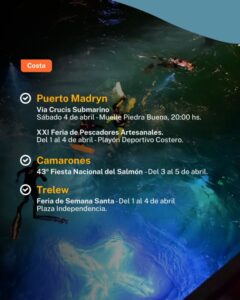 En Puerto Madryn, el sábado 4 de abril se realizará el Vía Crucis Submarino, en el Muelle Piedra Buena a las 20:00 horas; y del 1 al 4, la XXI Feria de Pescadores Artesanales en el Playón Deportivo Costero.
