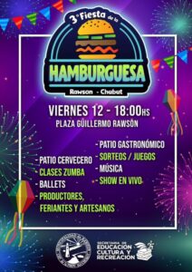 Fiesta Regional de la Hamburguesa. Con todos los espacios listos para recibir al público, la Secretaría de Educación, Cultura y Recreación de la Municipalidad de Rawson invita a los vecinos y vecinas a sumarse este viernes 12 de diciembre, desde las 18 horas, en la Plaza Guillermo Rawson, para disfrutar de la Tercera Edición de la Fiesta Regional de la Hamburguesa. Con entrada libre y gratuita, el evento contará con la participación de 166 productores, 28 food trucks y 35 feriantes, consolidándose como uno de los encuentros más importantes y convocantes de la ciudad.