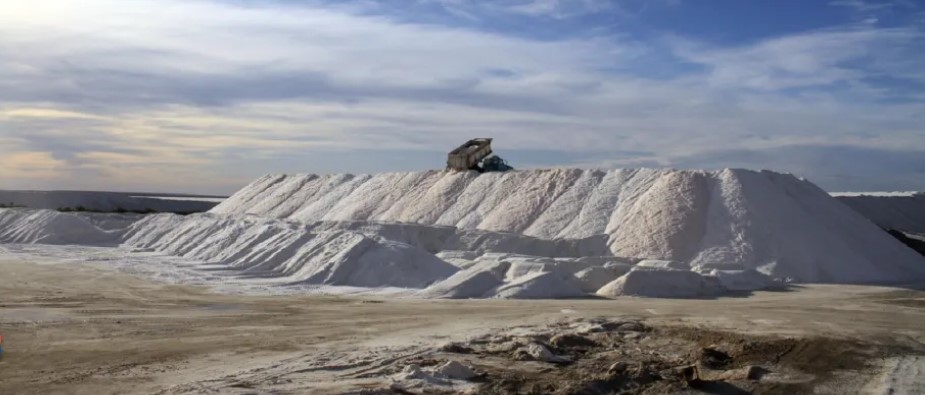 Dentro del salar, las enormes parvas de sal sorprenden por sus dimensiones y el movimiento constante de maquinarias y camiones revela la magnitud de la actividad.
