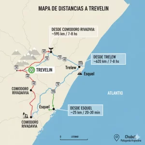 Llegar a Trevelin, el «Pueblo del Molino», es parte de la aventura patagónica. Para quienes viajan desde Comodoro Rivadavia, la distancia aproximada es de 600 kilómetros, un trayecto que se puede realizar en automóvil en alrededor de siete horas a través de las Rutas Nacionales 26 y 40. Desde Trelew, el recorrido es de unos 640 kilómetros, combinando las Rutas Nacionales 25 y 40, lo que se traduce en un viaje de aproximadamente seis a siete horas.