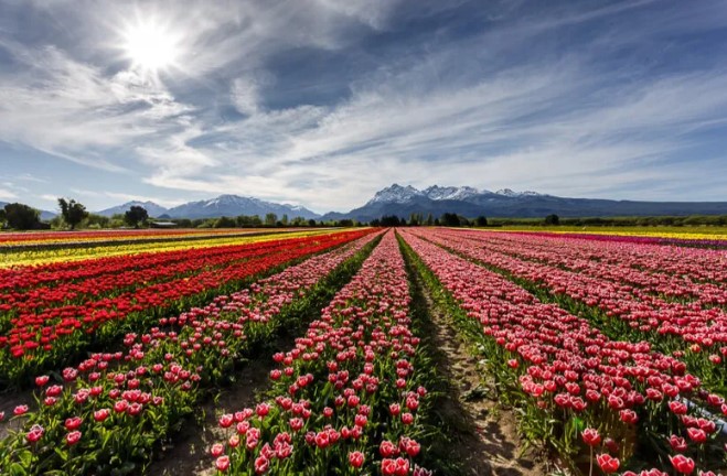 Las actividades para realizar en Trevelin varían mucho según la época del año. Si viajas en primavera, el campo de tulipanes en plena floración ofrece una postal icónica e inolvidable con las montañas de fondo. En un desvío de la Ruta 259, se encuentra el mayor emprendimiento productor de tulipanes del país.