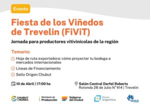 En el marco de la esperada Fiesta de los Viñedos (FiViT), la localidad de Trevelin se prepara para recibir una jornada de capacitación técnica y financiera destinada a productores locales. El evento tendrá lugar el próximo viernes 10 de abril a las 17:00 horas en el Salón Central Derfel Roberts.